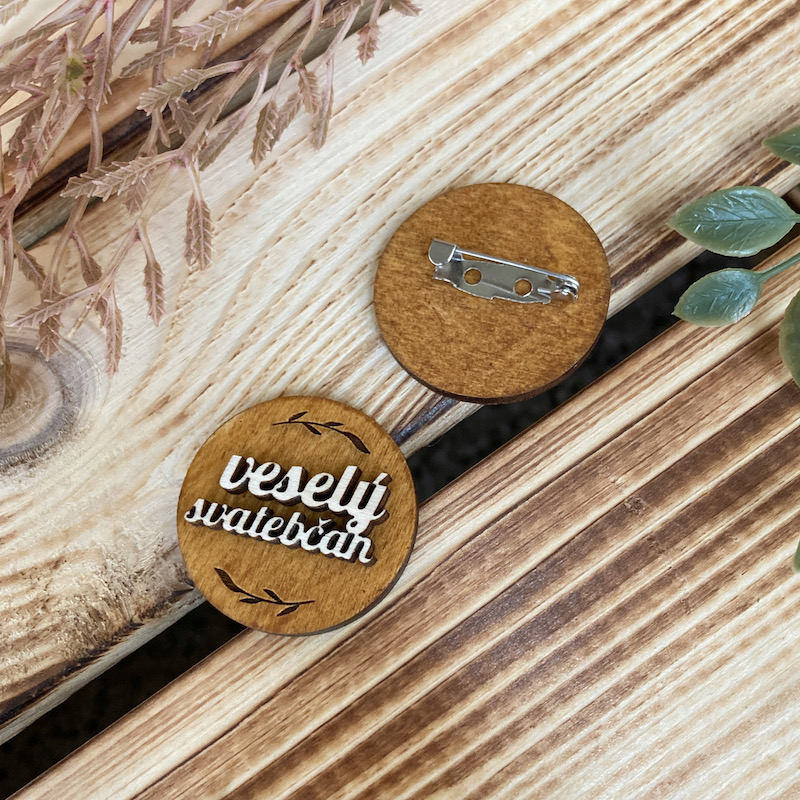 Elegantní dřevěná brož s 3D nápisem Veselý svatebčan.