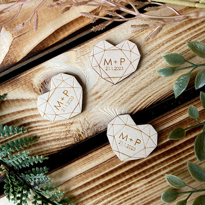 Dřevěné geometrické srdce vašemi iniciály.
