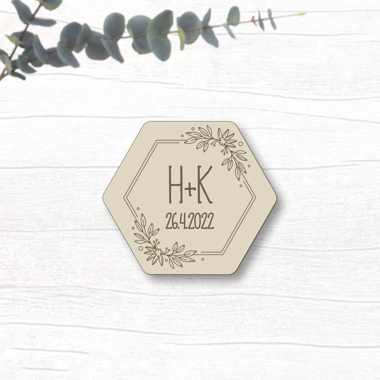 Elegantní dřevěná brož s iniciály a datem svatby vyrobená ze světlé březové překližky.
