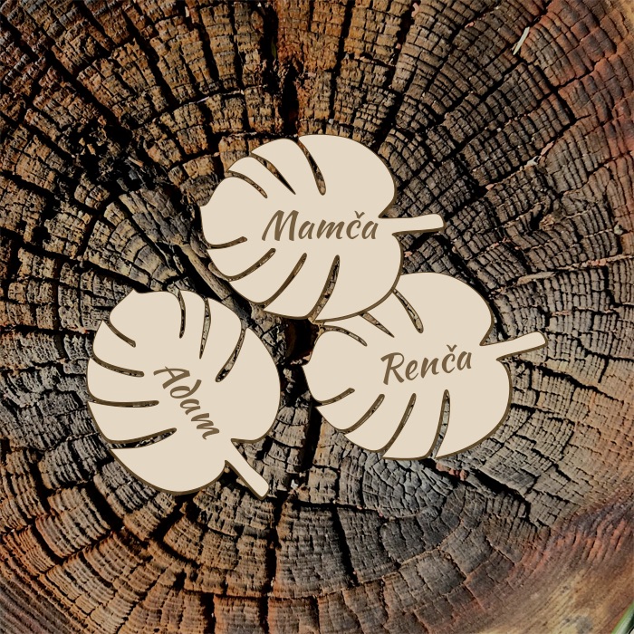 List Monstery z dřevěné překližky s vygravírovaným jménem, iniciály nebo čímkoliv jiným dle vašeho zadání. Vhodné na dárek, nebo jako jmenovka ke svatebnímu stolu.