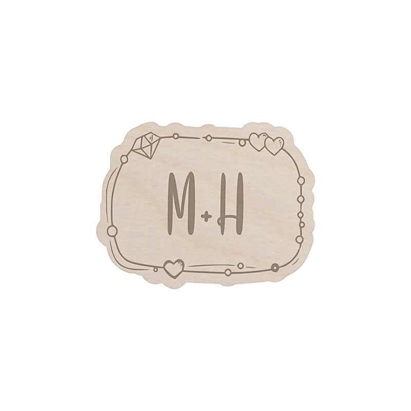 Elegantní dřevěná brož s iniciály vyrobená ze světlé březové překližky.