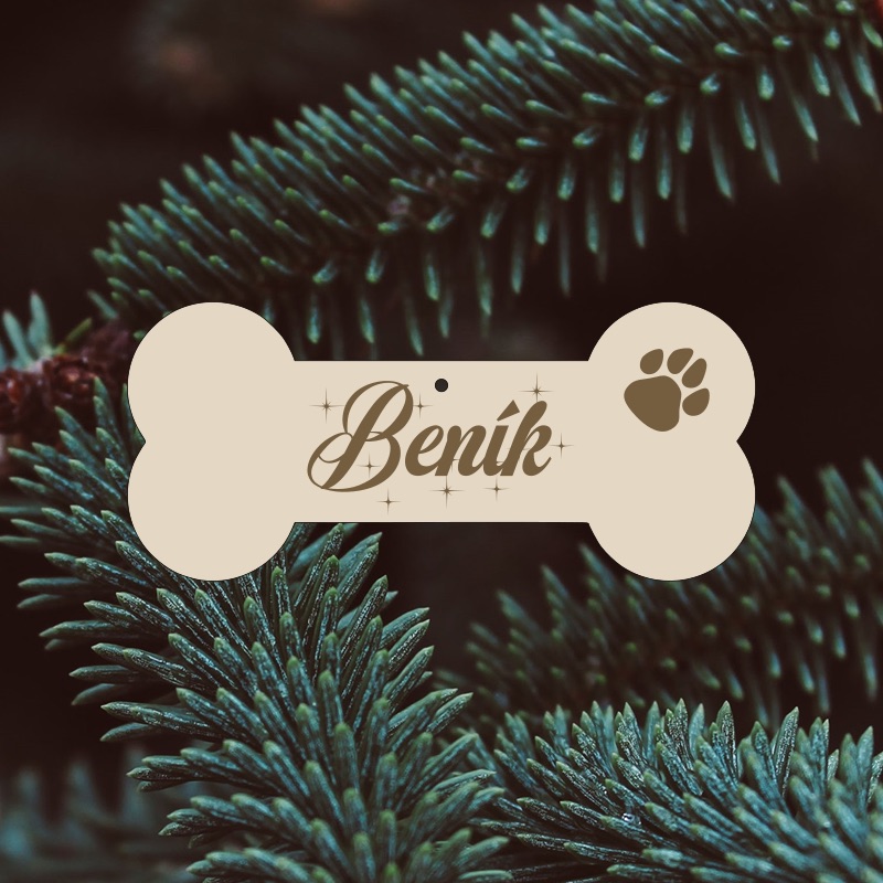 Dřevěná vánoční ozdoba na stromeček v motivu psí kosti, tlapky a jména pejska.