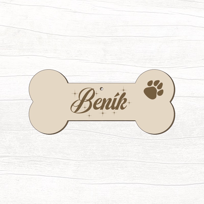 Dřevěná dekorace v motivu psí kosti, tlapky a jména pejska.