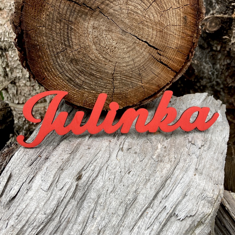 Laserem vyřezávaná jména z kvalitní březové překližky s červeným matným nástřikem.