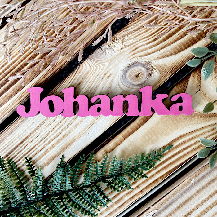 Laserem vyřezávaná jména z kvalitní březové překližky se starorůžovým matným nástřikem.