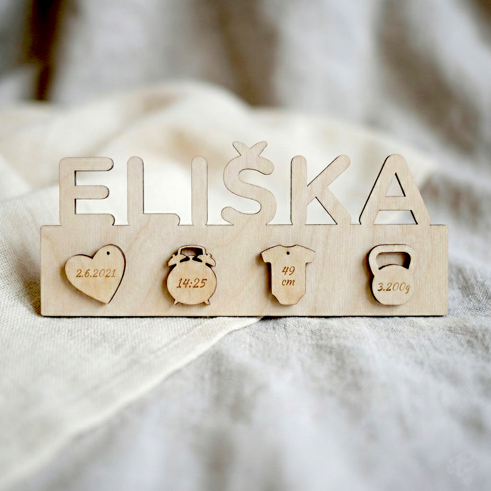 - Dřevěné jméno s porodními údaji