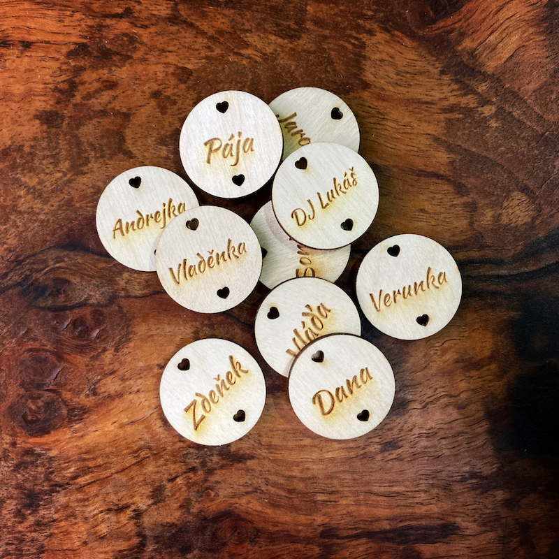Dřevěné jmenovky na dárky se dvěma otvory (srdíčka) na provlečení.