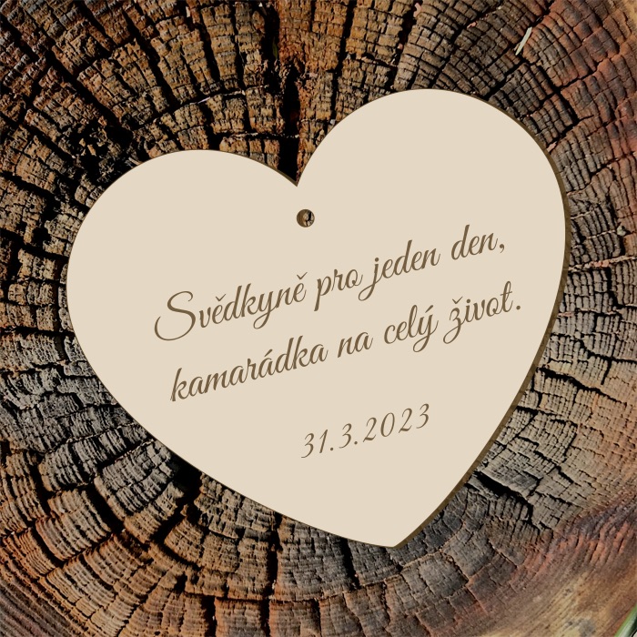 Dřevěné srdce s poděkováním pro svědkyni a vlastními údaji.