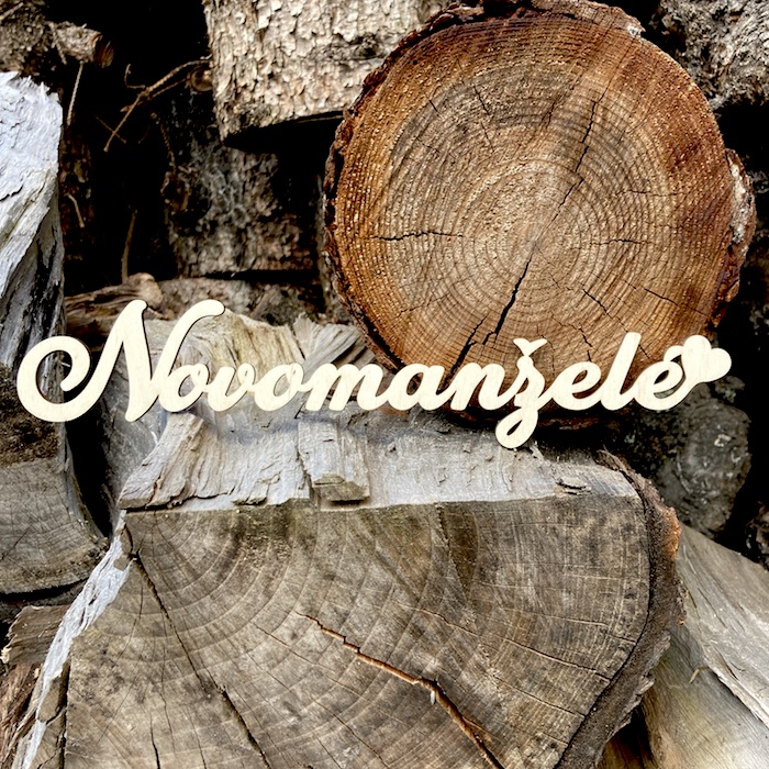 Laserem vyřezávaný nápis Novomanželé z kvalitní březové překližky.