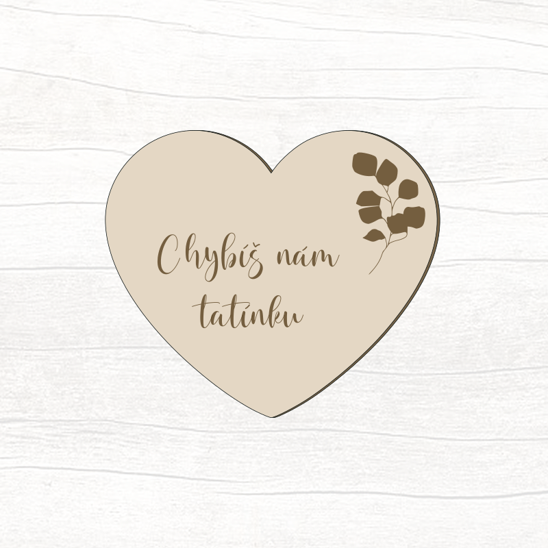 Tento gravírovaný a vyřezávaný smuteční ornament ve tvaru srdce, je vyroben z přírodního březového dřeva a nese jemně gravírovaný nápis „Chybíš nám tatínku“. Symbolizuje lásku a vzpomínku na milovaného člověka, který nás opustil. Minimalistický design s decentním listovým motivem na straně dodává srdci eleganci a citlivý nádech, který se hodí pro umístění na pietní místo, či památeční prostor.