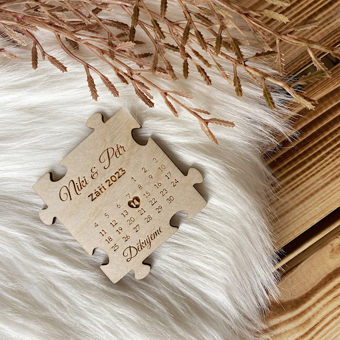 Svatební magnetka ve tvaru dílku puzzle je milá a osobní pozornost pro svatební hosty. Na magnetku doplníme vaše jména, měsíc a rok a kalendářní přehled, díky kterému si hosté snadno připomenou datum svatby. Vhodné jako „děkovná“ drobnost – působí decentně, romanticky a zároveň prakticky.