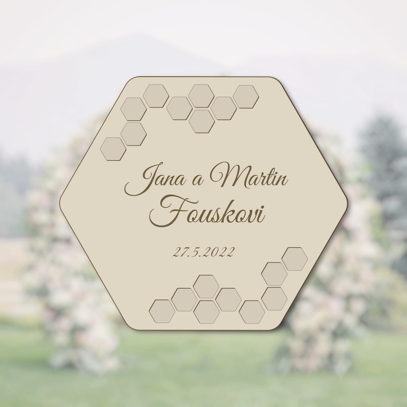 Stylová dřevěná uvítací tabule ve tvaru hexagonu se společným příjmením novomanželů a datem svatby, Uvítací tabuli můžete kdekoliv jen tak opřít, nebo ji usadit například na malířský stojan a nebo ji zavěsit. Užasně vypadá v kombinaci se zeleným břečťanem nebo eukalyptem.