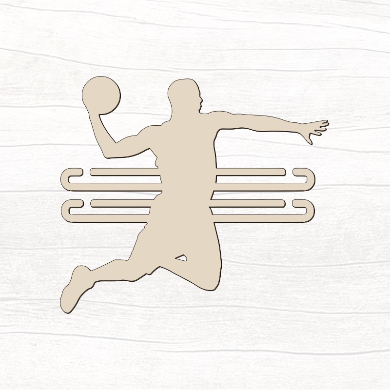 Dřevěný věšák na medaile s motivem basketbalisty.