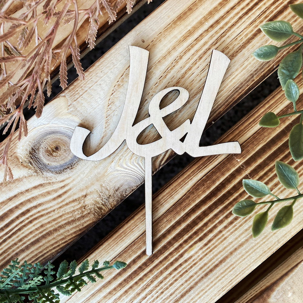 Ozdobný dřevěný zápich do dortu s motivem jejich iniciálů, díky kterému i z obyčejného dortu vytvoříte dort jedinečný, který bude každý obdivovat.