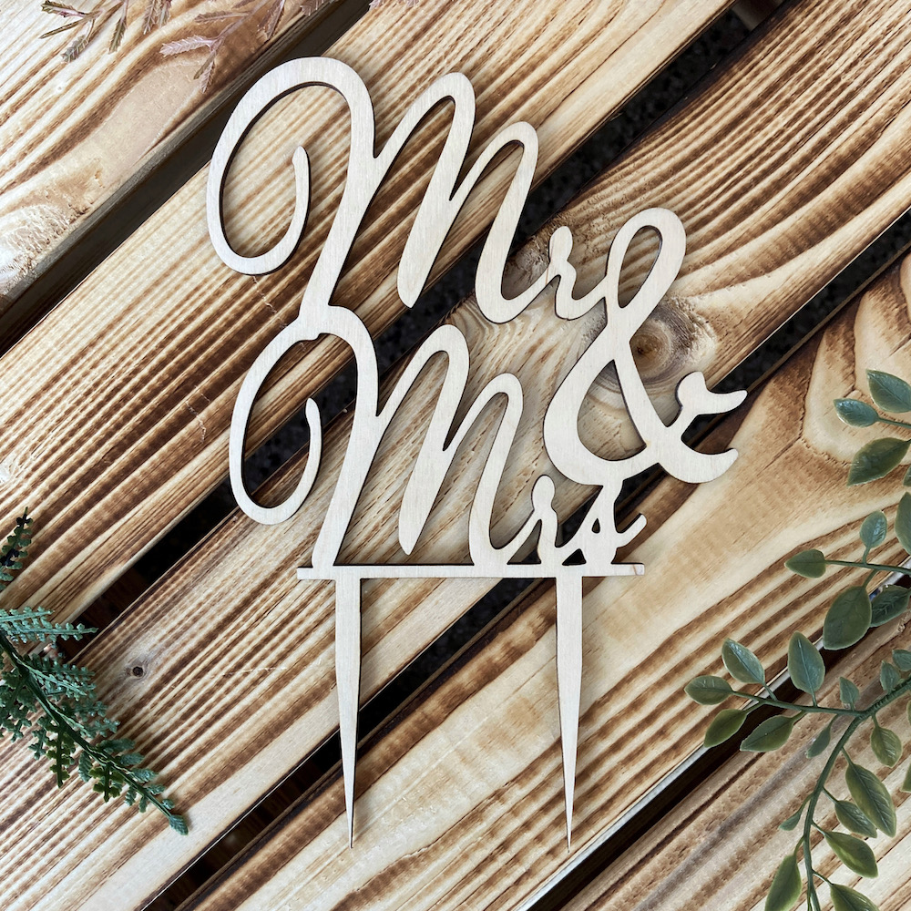 Tento elegantní dřevěný zápich do dortu s nápisem „Mr & Mrs“ je skvělým doplňkem pro každou svatební hostinu. Precizně vyřezávaný zápich v moderním kaligrafickém stylu krásně ozdobí váš svatební dort a dodá mu osobitý a romantický vzhled.