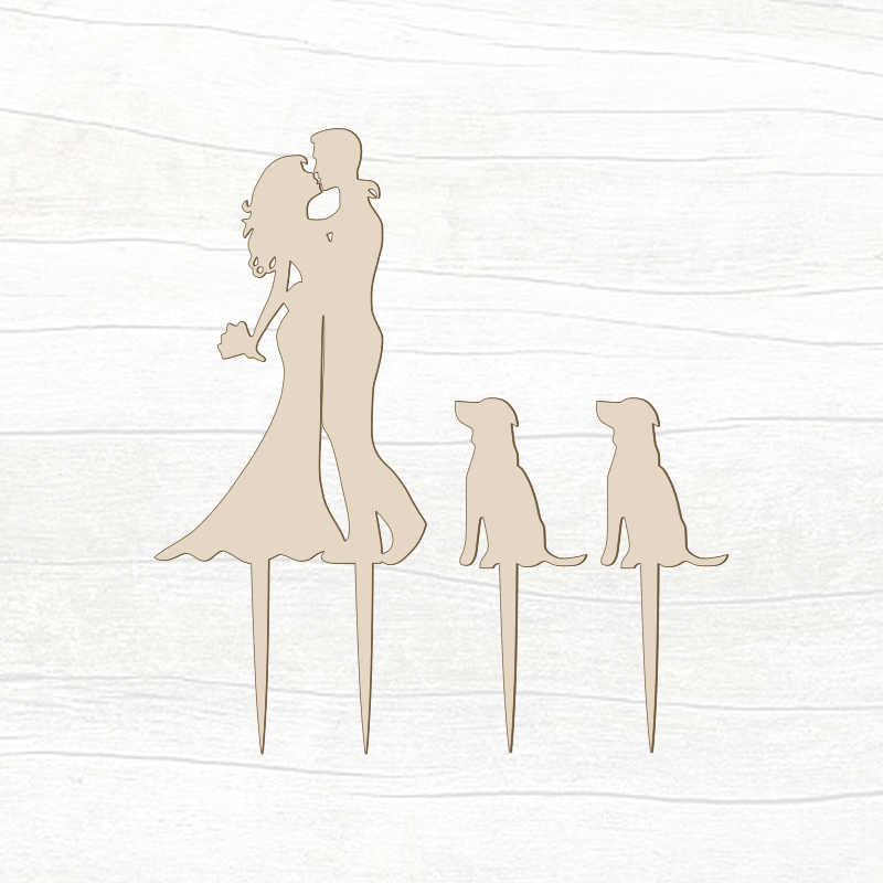 Ozdobný dřevěný zápich do dortu s motivem novomanželů a jejich psi, díky kterému i z obyčejného dortu vytvoříte dort jedinečný, který bude každý obdivovat.