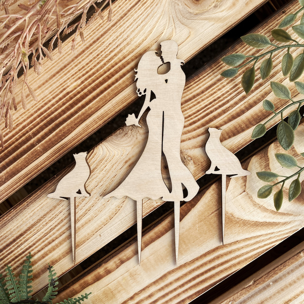 Ozdobný dřevěný zápich do dortu s motivem novomanželů a jejich dvě kočky, díky kterému i z obyčejného dortu vytvoříte dort jedinečný, který bude každý obdivovat.