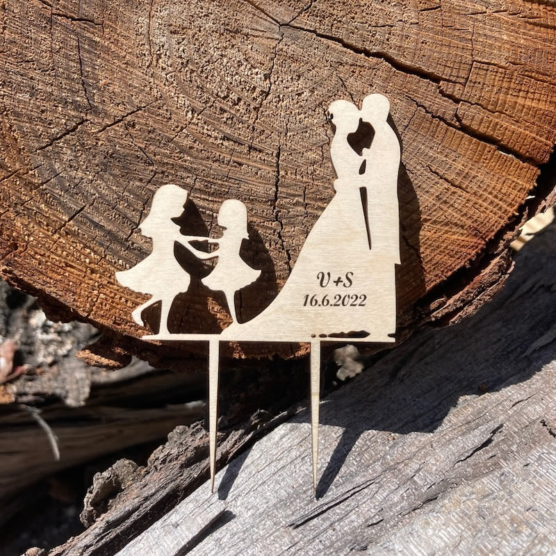 Ozdobný dřevěný zápich do dortu s motivem novomanželů a dvou holčiček, díky kterému i z obyčejného dortu vytvoříte dort jedinečný, který bude každý obdivovat.