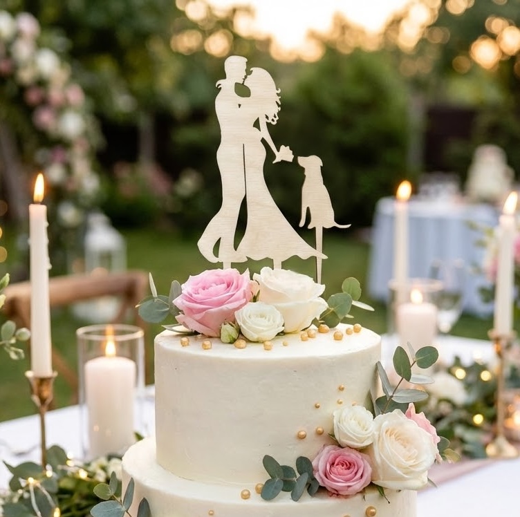 Romantický detail, který doladí svatební dort během pár vteřin. Silueta novomanželů s kyticí a věrným psem působí něžně a nadčasově – oceníte ji na fotkách i při krájení dortu. Získáte dekoraci, která podtrhne váš příběh a lásku ke čtyřnohému parťákovi.