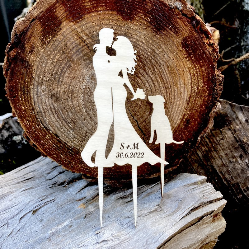 Ozdobný dřevěný zápich do dortu s motivem novomanželů a jejich psem, díky kterému i z obyčejného dortu vytvoříte dort jedinečný, který bude každý obdivovat.
