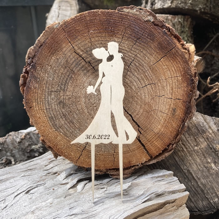 Ozdobný dřevěný zápich do dortu s motivem novomanželů, díky kterému i z obyčejného dortu vytvoříte dort jedinečný, který bude každý obdivovat.
