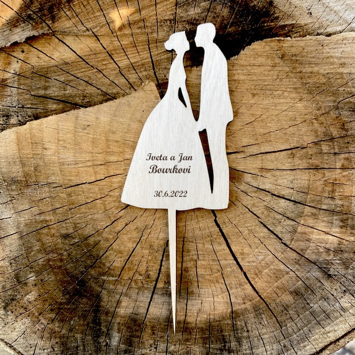 Ozdobný dřevěný zápich do dortu s motivem novomanželů, díky kterému i z obyčejného dortu vytvoříte dort jedinečný, který bude každý obdivovat.