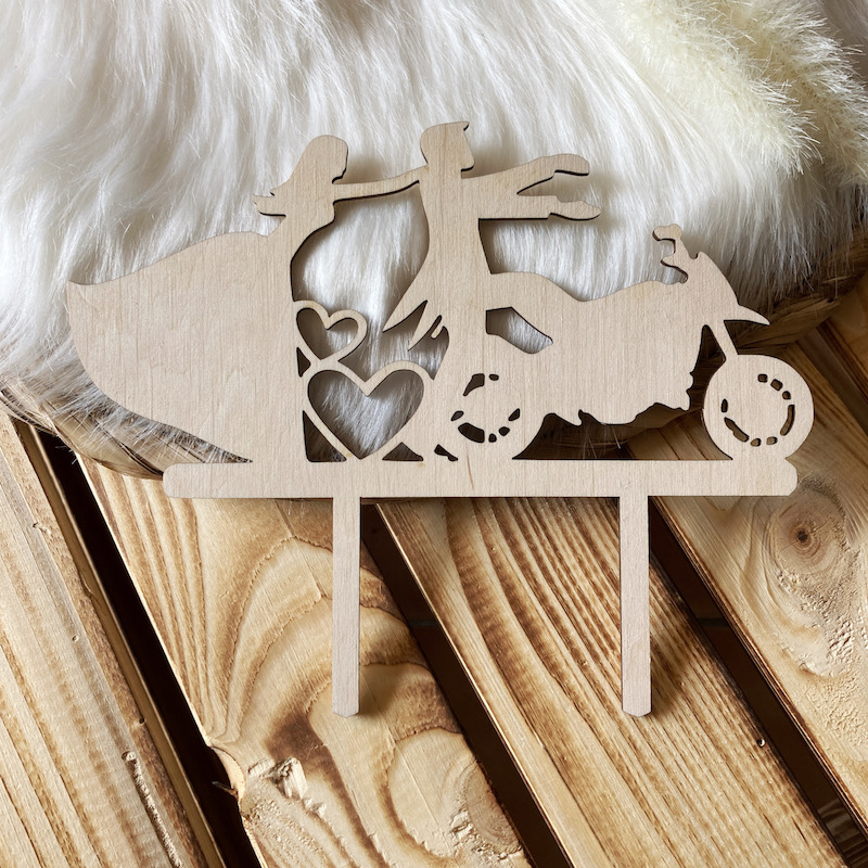 Tento originální dřevěný svatební zápich je dokonalým doplňkem pro novomanžele, kteří milují dobrodružství! Zápich je vyřezaný z březového dřeva a zobrazuje zamilovaný pár na motorce, což symbolizuje svobodu a vzrušení z nové životní cesty.