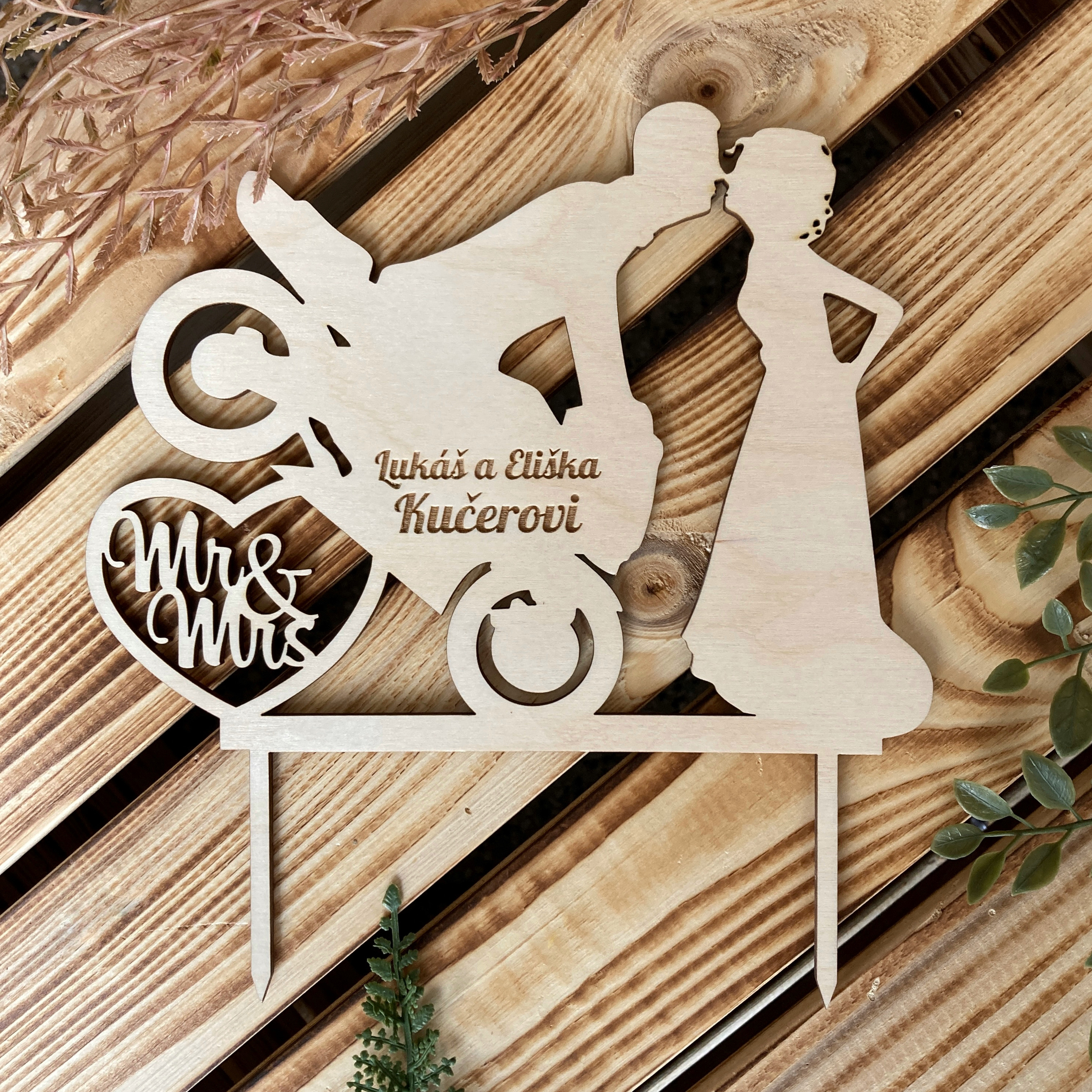 Tento jedinečný dřevěný svatební zápich zobrazuje romantický moment novomanželů, kde ženich na motorce políbí svou nevěstu. Zápich je vyroben z kvalitního dřeva a personalizovaný jmény novomanželů a jejich společným příjmením. Dekoraci doplňuje elegantní srdce s nápisem „Mr & Mrs“, což zdůrazňuje romantiku a symboliku svatebního dne.