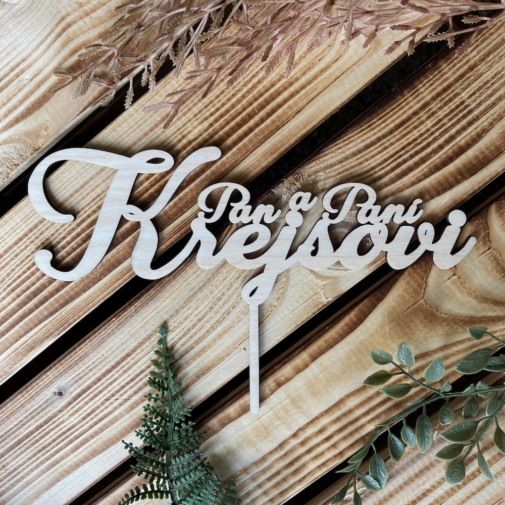 Ozdobný dřevěný zápich do dortu s příjmením novomanželů, díky kterému i z obyčejného dortu vytvoříte dort jedinečný, který bude každý obdivovat.