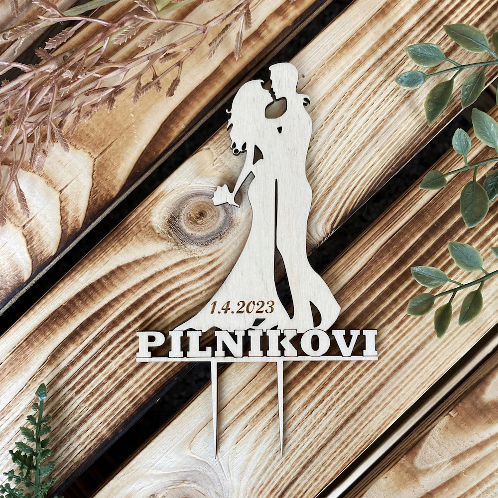 Zápich je vyroben z kvalitního, přírodního dřeva, což mu dodává krásný přírodní vzhled a zároveň snadno zapadne do jakéhokoliv svatebního stylu – ať už jde o rustikální, boho nebo moderní svatební výzdobu. Jemně detailní design s vyobrazením ženicha a nevěsty působí romanticky a vkusně.