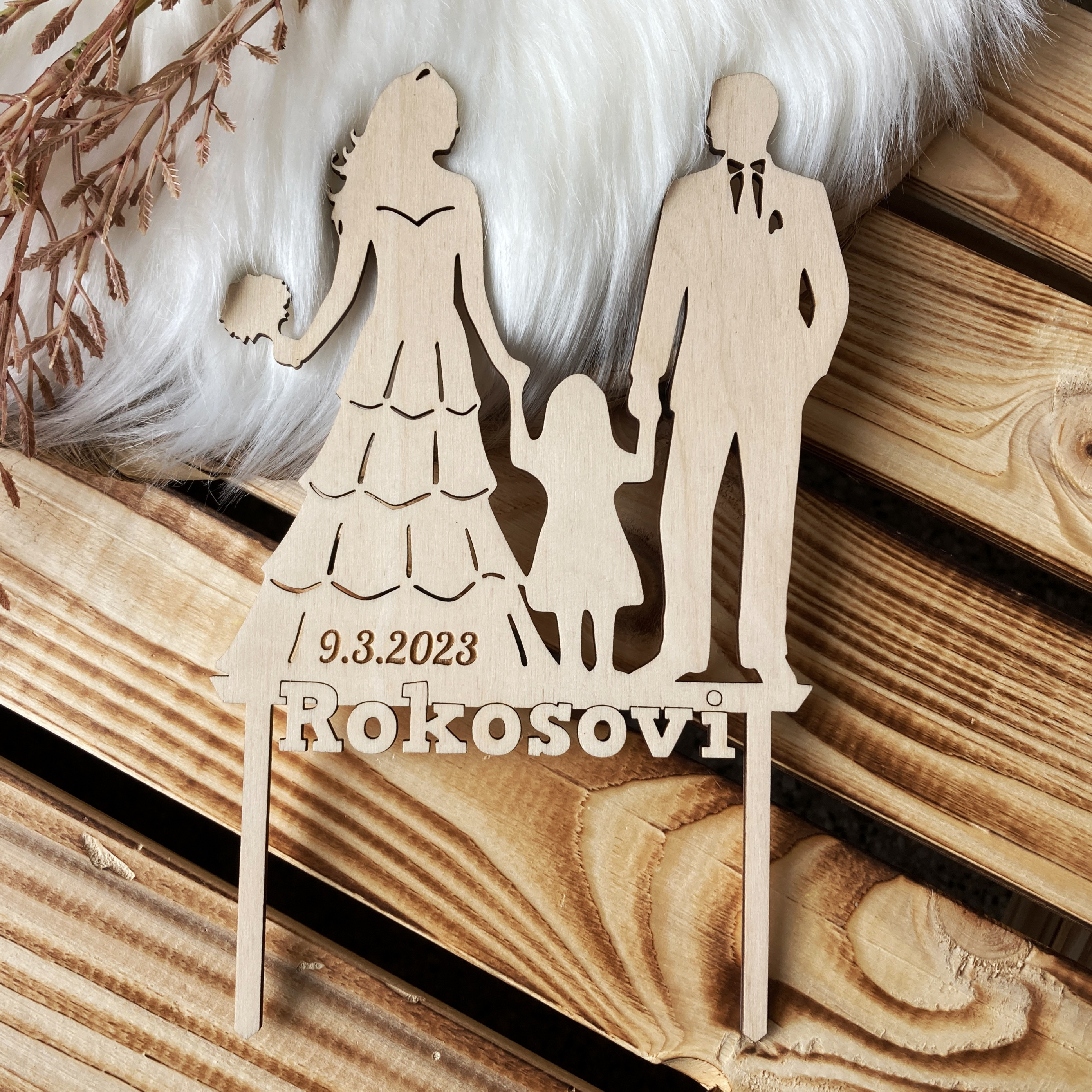 Ozdobný dřevěný zápich do dortu se svatebním motivem a společným příjmením, díky kterému i z obyčejného dortu vytvoříte dort jedinečný, který bude každý obdivovat.