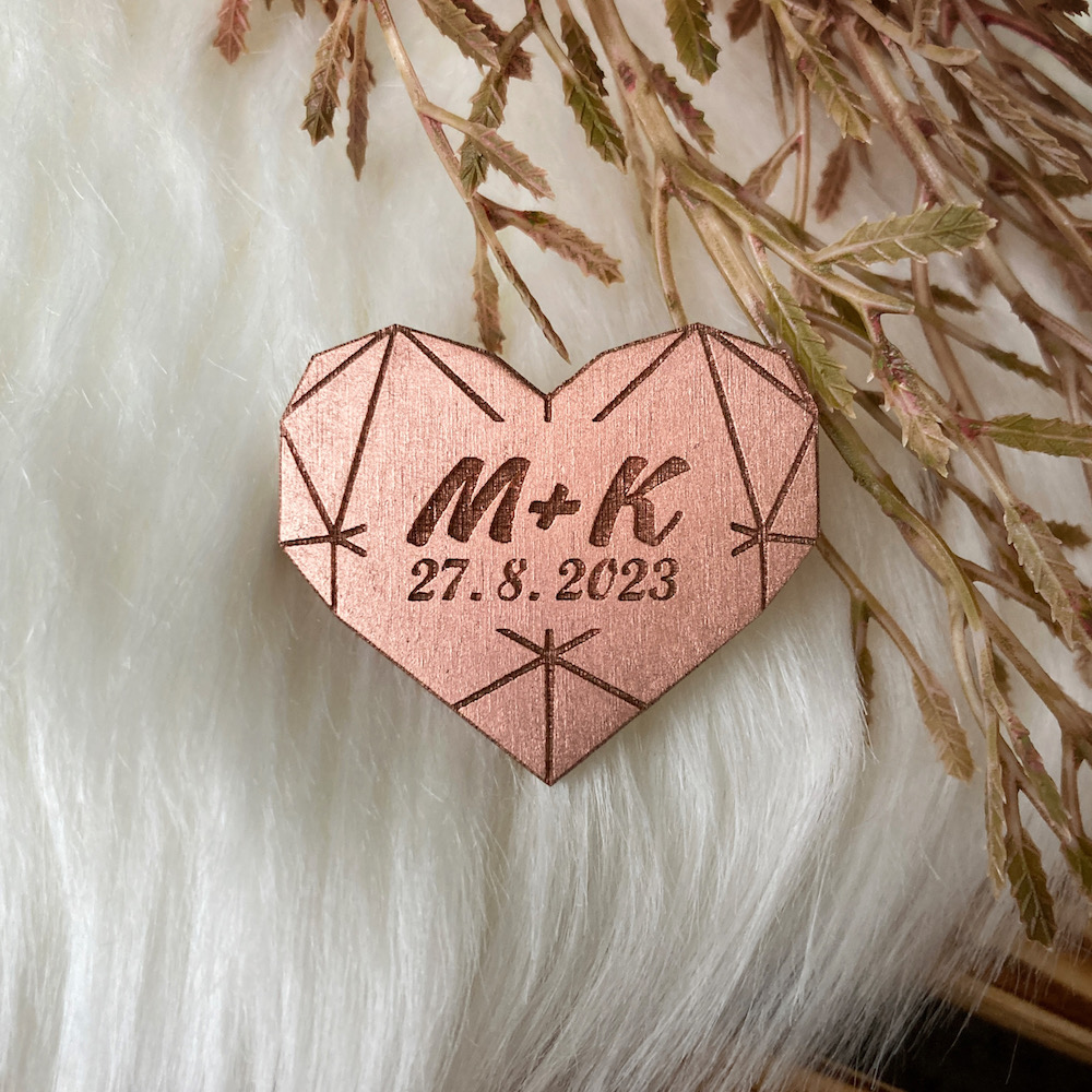 - Brož - srdce s inicialy a datem v měděném odstínu