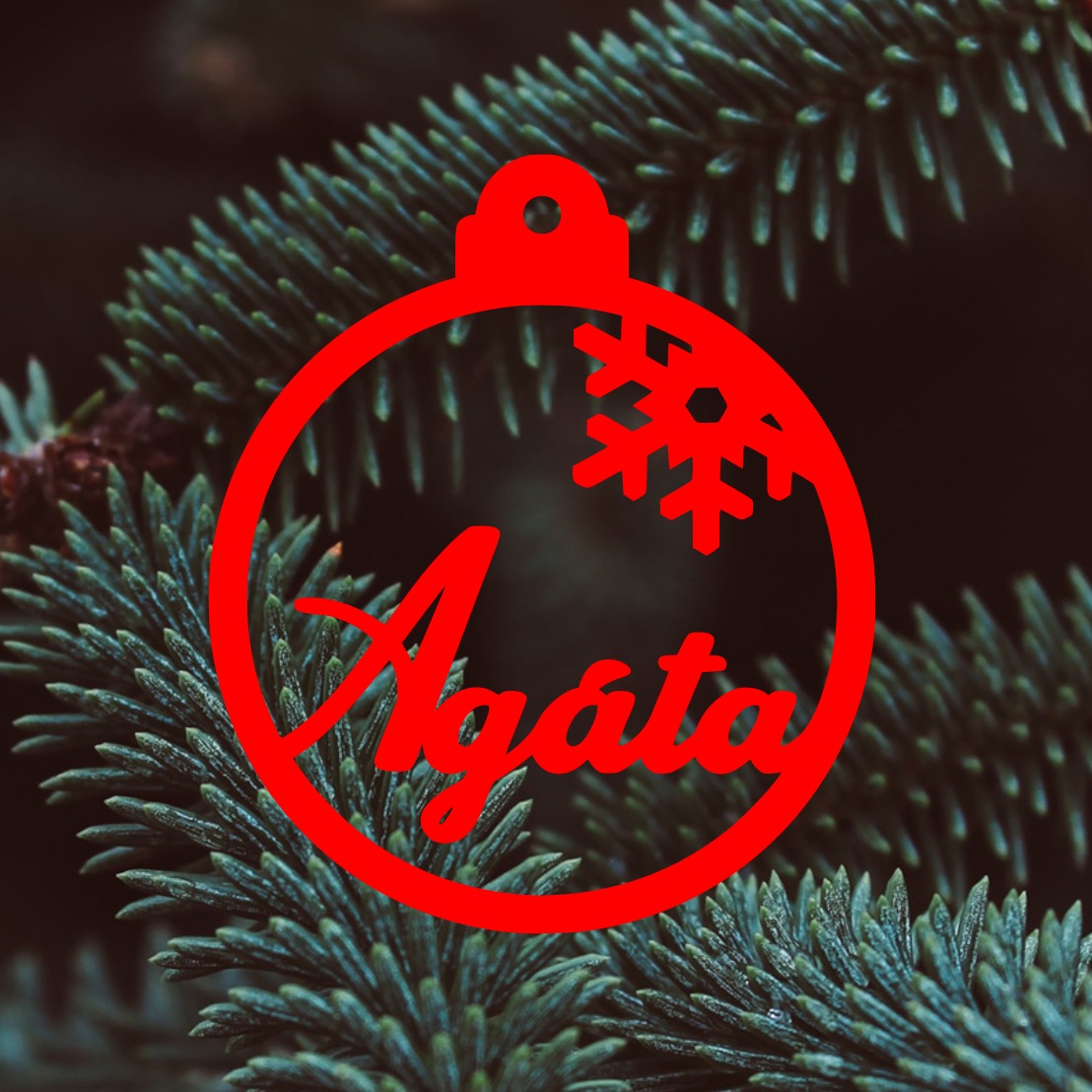 Červená vánoční ozdoba na stromeček s vyřezaným jménem. Jméno na obrázku je pouze ilustrační. Ozdoby vám vyrobíme s vašimi jmény.