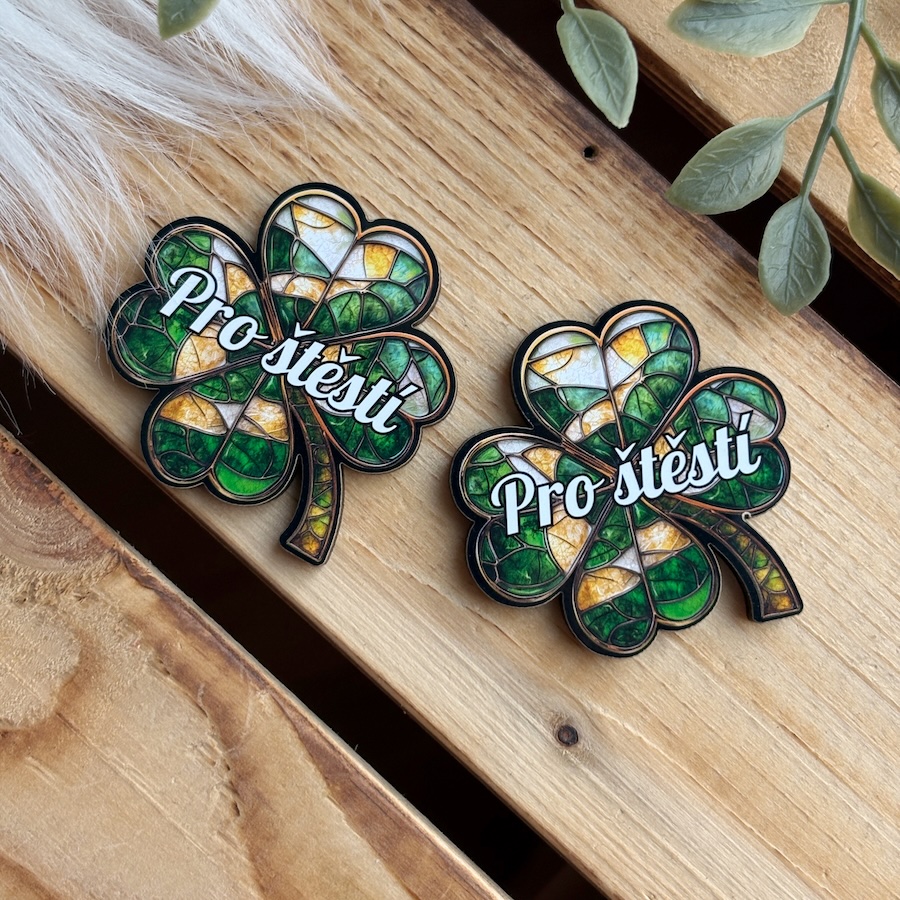 Přívěsek s motivem čtyřlístku, tradičního symbolu štěstí a pohody. Tento malovaný design zachycuje čtyřlístek v živých zelených odstínech s jemnými ornamentálními detaily uvnitř lístků. Motiv je zasazen do přírodní scenérie s rozkvetlými sedmikráskami na světle modrém pozadí, doplněný "Pro štěstí".
