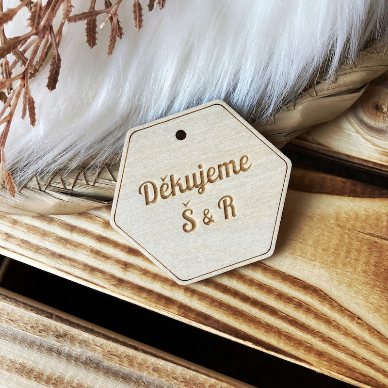 Dřevěné hexagony s vygravírovaným jménem, iniciály, poděkováním, nebo čímkoliv jiným dle vašeho zadání. Vhodné na dárek (například sklenku medu), nebo jako jmenovka ke svatebnímu stolu.