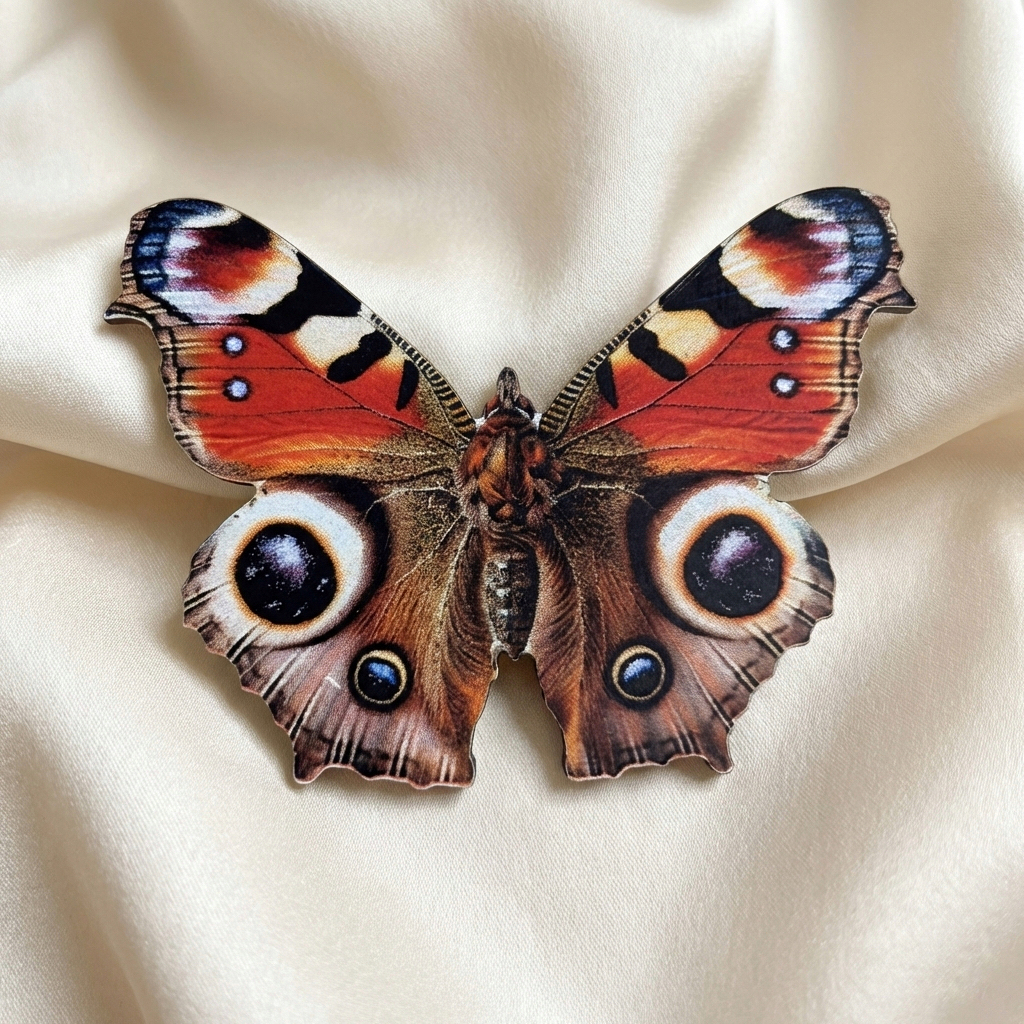 Dřevěná brož „Babočka“ je stylový doplněk s detailní barevnou ilustrací motýlích křídel. Ze zadní strany je opatřená kovovým brožovým zapínáním, díky kterému ji snadno připnete tam, kde chcete vyniknout – na klopu, šálu, tašku nebo čepici.