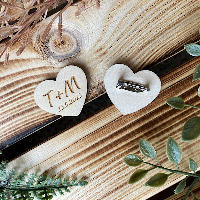 - Dřevěná brož - Srdce a iniciály a datem