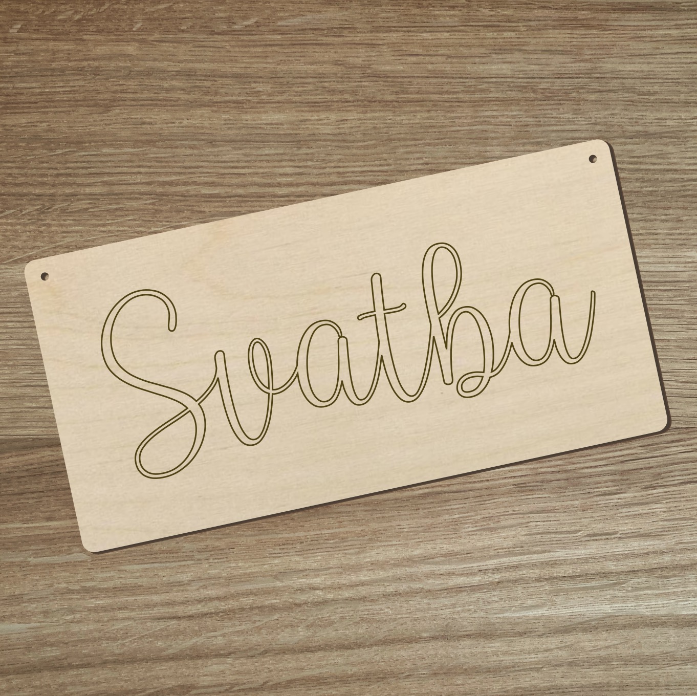Dřevěná cedulka Svatba v přírodní barvě světlého dřeva.
