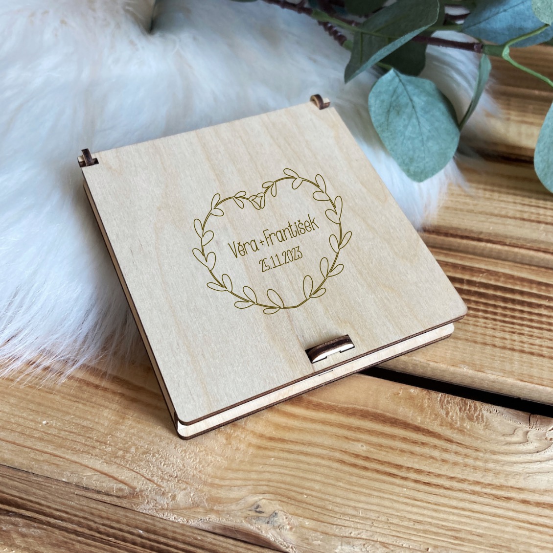 Dřevěná krabička na ten nejlepší svatební dar - peníze. Na vrchní straně je gravírovaný pamětní motiv, uvnitř krabičky pak rovněž vygravírovaná gratulace novomanželům a podpisy gratulantů.