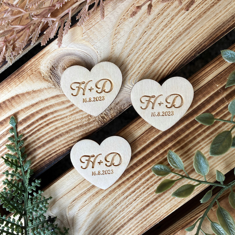 Jemný detail, který udělá velký dojem. Dřevěná srdíčka s iniciály a datem dodají vašemu dni osobní kouzlo a vytvoří hezkou památku pro vás i vaše hosty. Oceníte přírodní vzhled, čistý design a možnost personalizace.