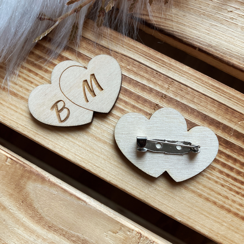 Dřevěná svatební brož ve tvaru dvou propojených srdcí s vlastními iniciály.
