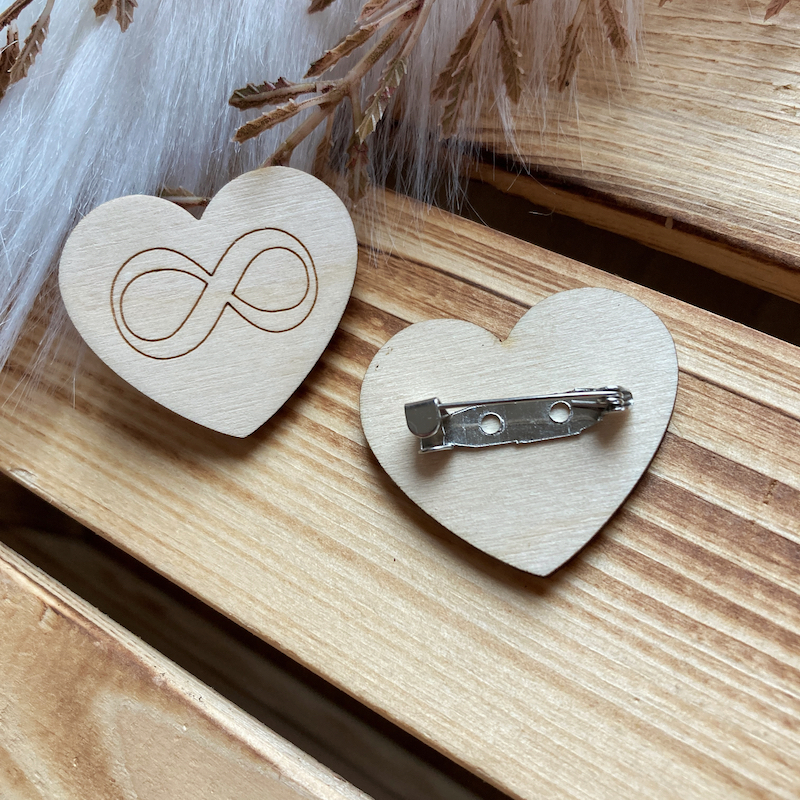 Dřevěná svatební brož ve tvaru srdce se znakem pro nekonečno.