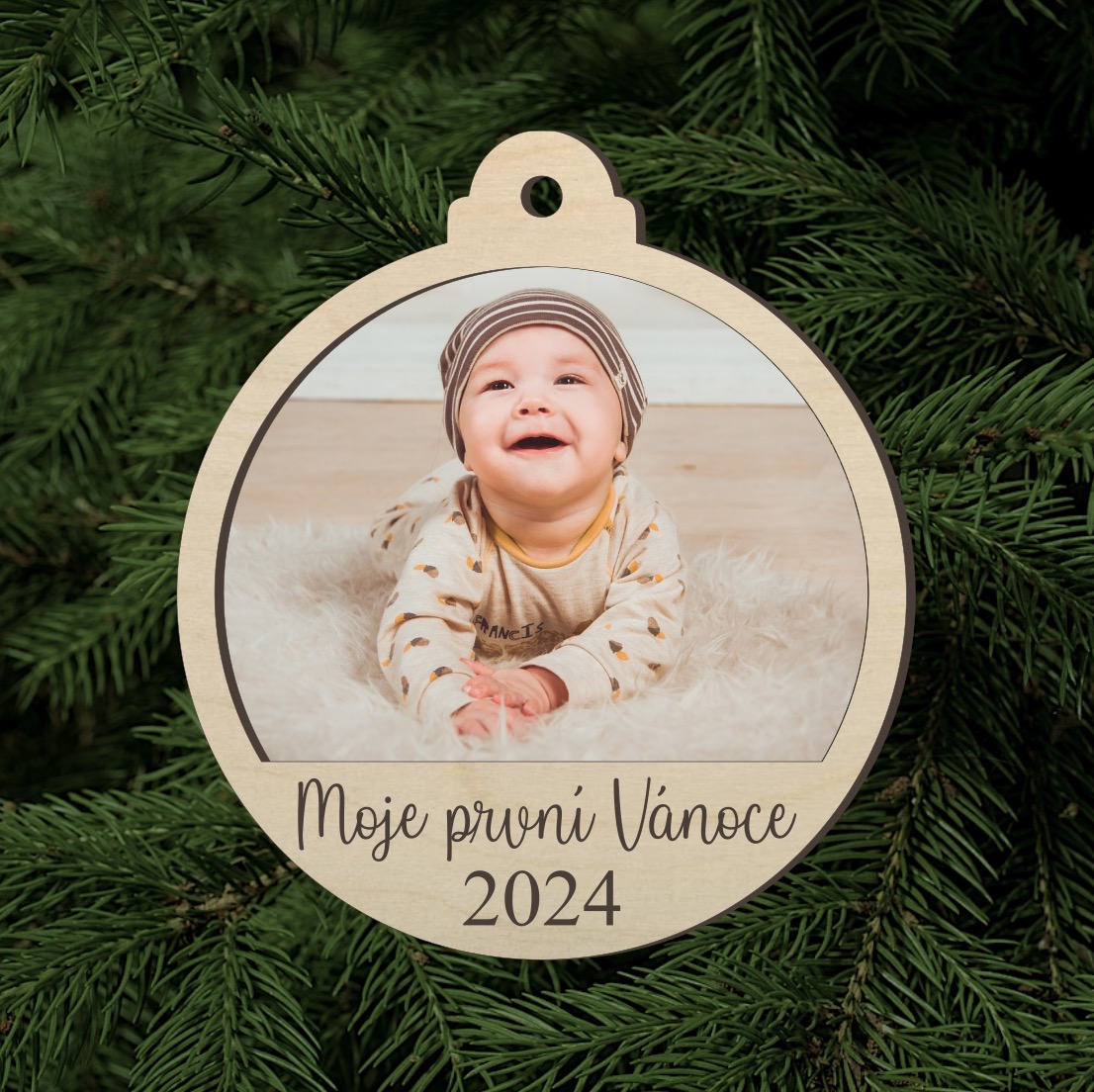 Na ozdobě je elegantní nápis „Moje první Vánoce“ a aktuální rok v době objednání, což ji činí skvělým dárkem pro novorozence nebo jako osobní dekoraci pro vaše Vánoce. Ozdoba je vyrobena z kvalitního dřeva, což ji zaručuje trvanlivost a přírodní vzhled.