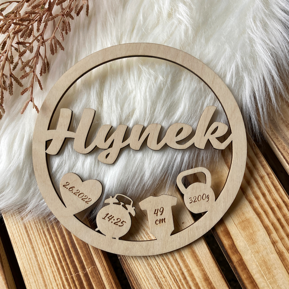 Vytvořte si jedinečnou vzpomínku na první okamžiky života vašeho dítěte s originální dřevěnou dekorací! Tato dekorace nese všechny důležité údaje – jméno, datum a čas narození, váhu i výšku vašeho miminka. Díky kvalitnímu zpracování a elegantnímu designu bude tato dekorace dokonalým doplňkem do dětského pokoje a milou připomínkou nejkrásnějšího dne vašeho života.