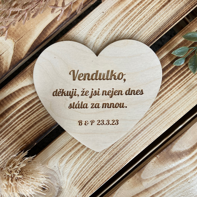 Dřevěné srdce s poděkováním pro svědkyni s vlastními údaji.