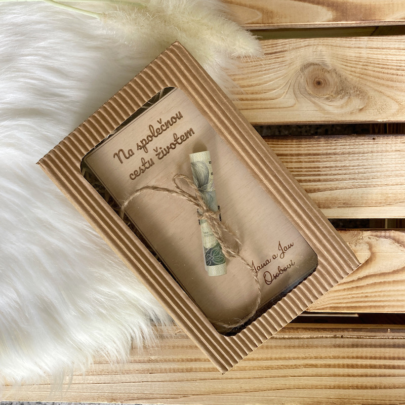 Dřevěné svatební přání jsou velmi oblíbenou alternativou ke klasickým papírovým blahopřáním. Darujte peníze originálněji a stylově. S naší kraftovou dárkovou krabičkou s dřevitou výplní jsou naše přání naprosto ideálním párem, který údělá velkou radost každému novomanželi!