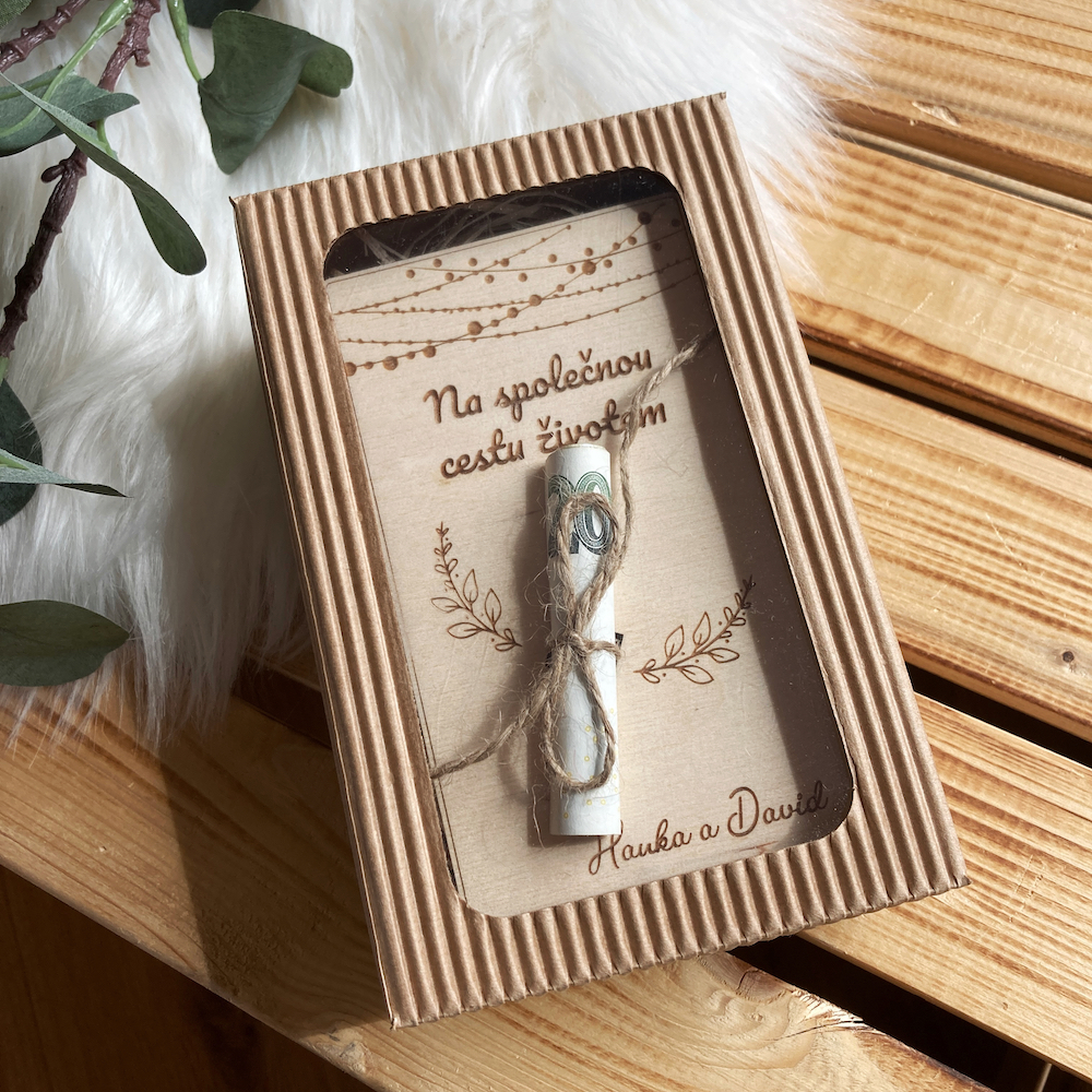 Dřevěné svatební přání jsou velmi oblíbenou alternativou ke klasickým papírovým blahopřáním. Darujte peníze originálněji a stylově. S naší kraftovou dárkovou krabičkou s dřevitou výplní jsou naše přání naprosto ideálním párem, který údělá velkou radost každému novomanželi!