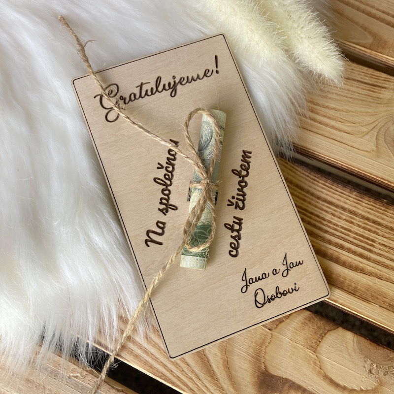 Dřevěné svatební přání jsou velmi oblíbenou alternativou ke klasickým papírovým blahopřáním. Darujte peníze originálněji a stylově. S naší kraftovou dárkovou krabičkou s dřevitou výplní jsou naše přání naprosto ideálním párem, který údělá velkou radost každému novomanželi!