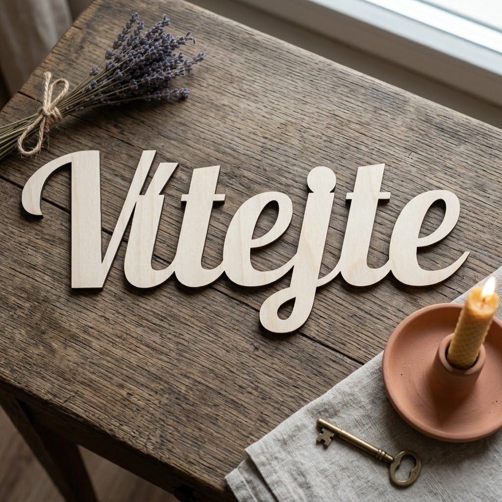 Dřevěný nápis „Vítejte“ – stylová dřevěná dekorace na dveře i do interiéru