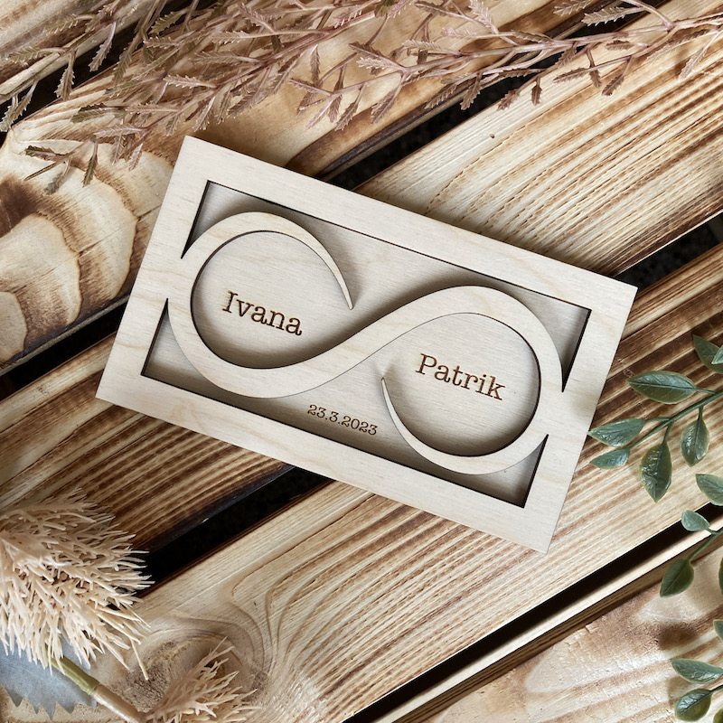 Dřevěný podnos na snubní prsteny je jedinečným a krásně provedeným doplňkem vašeho svatebního obřadu. Vyroben z kvalitního přírodního dřeva, zaujme precizním designem se symbolem nekonečna, který symbolizuje věčnou lásku a spojení dvou životů.